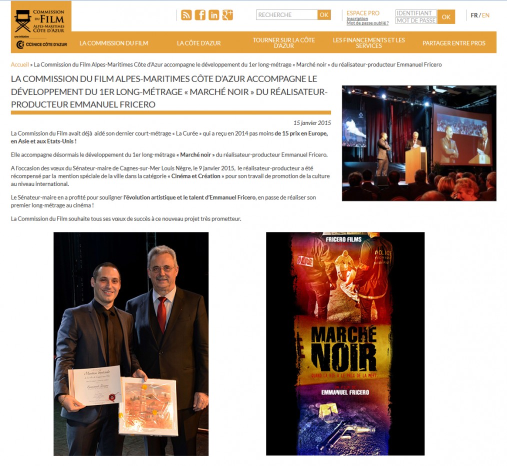 En savoir + ›Le 9 janvier 2015, le réalisateur-producteur Emmanuel Fricero a été honoré d’une Mention Spéciale de la Ville de Cagnes-sur-Mer (06) dans la catégorie « cinéma et création », après sa très belle année 2014 où son dernier film, « La Curée », a reçu pas moins de 15 prix en Europe, en Asie et aux […]