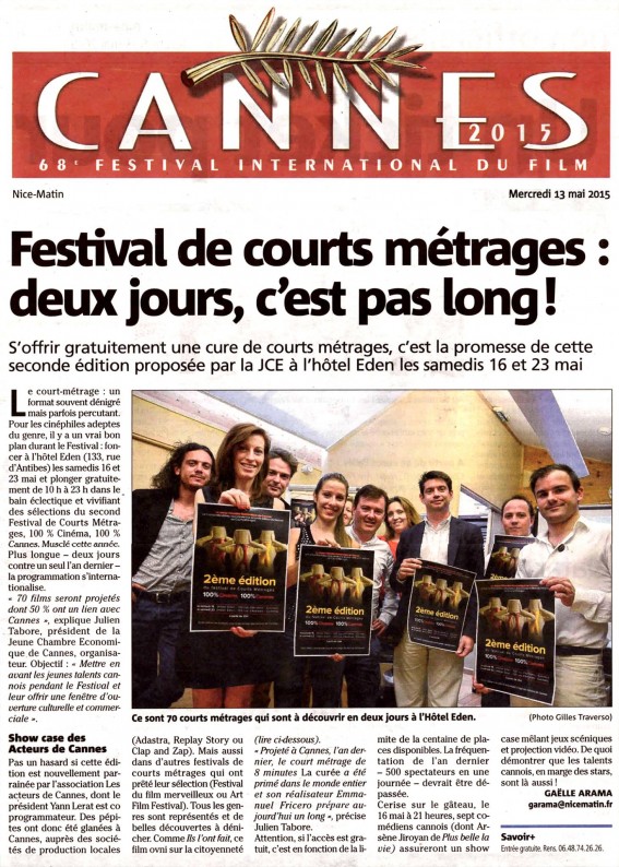 En savoir + ›Mercredi 13 mai 2015, le 68e Festival de Cannes a officiellement ouvert ses portes depuis quelques minutes, et la presse parle déjà d’Emmanuel Fricero ! Le quotidien Nice Matin du jour a consacré une page à un événement organisé par la Jeune Chambre Economique de Cannes en parallèle au « grand festival » : deux jours de […]