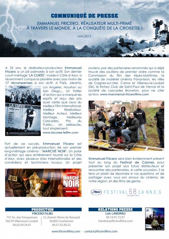 En savoir + ›Communiqué de Presse : Emmanuel Fricero, réalisateur multi-primé à travers le monde, à la conquête de la Croisette ! Lien Pdf : https://fricerofilms.com/wp-content/uploads/2015/05/communiquedepresse-Fricero-mai15.pdf Site internet « La Curée » : www.lacuree-lefilm.com Site internet « Marché Noir » : www.marchenoir.fricerofilms.com
