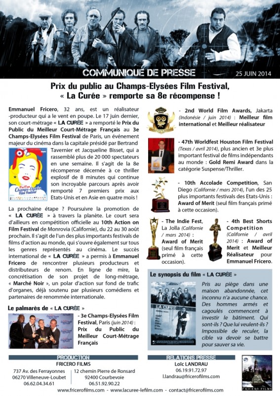 En savoir + ›Incroyable ! La Curée d’Emmanuel Fricero remporte le prix du public du Meilleur Court-Métrage Français au 3e Champs Elysées Film Festival de Paris ! Le premier prix français pour Fricero Films et quel prix ! Un véritable honneur et une vraie émotion pour nous tous en montant sur scène. Merci à toute l’équipe !