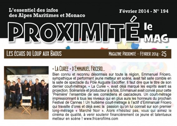 En savoir + ›« La Curée » d’Emmanuel Fricero, un court-métrage impressionnant à tous les niveaux… Article de presse sur l’Avant-Première paru dans le Magazine Proximité de Février 2014.