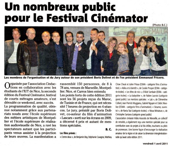 En savoir + ›Nice Matin – Un nombreux public pour le Festival Cinémator Article de presse paru le vendredi 1 avril 2011 dans le Nice Matin.