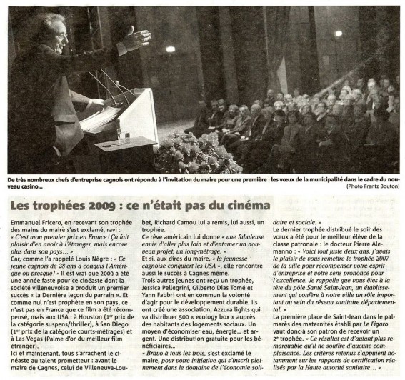 En savoir + ›Nice Matin – Les Trophées 2009 : ce n’était pas du cinéma. Article de presse paru le Mardi 18 Janvier 2010 dans le Nice Matin.