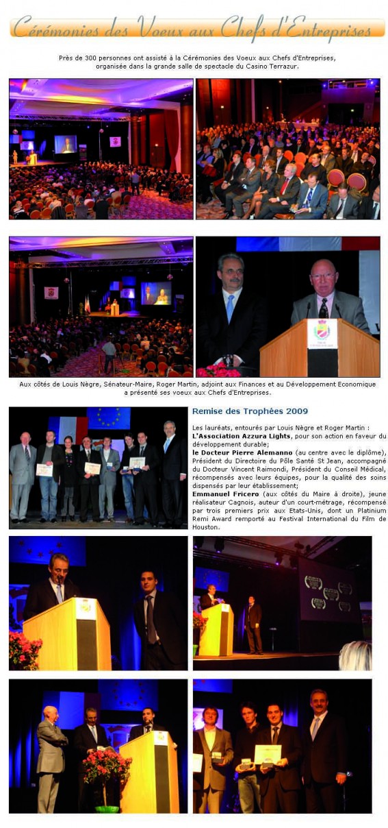 En savoir + ›Remise des Trophées 2009 lors de la Cérémonie des Vœux aux Chefs d’Entreprises. Article de presse paru en Janvier 2010 sur le site internet de la ville de Cagnes sur Mer sur la Remise des Trophées 2009.