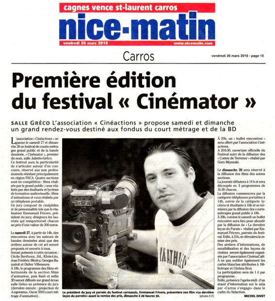 En savoir + ›Nice Matin – Emmanuel Fricero président du jury et parrain du festival »Cinémator » Article de presse paru le vendredi 26 mars 2010 dans le Nice Matin.