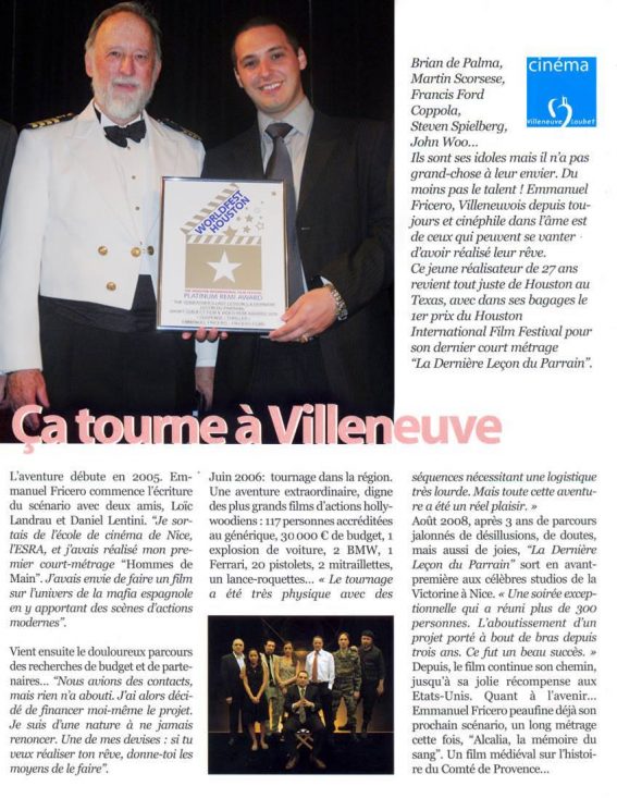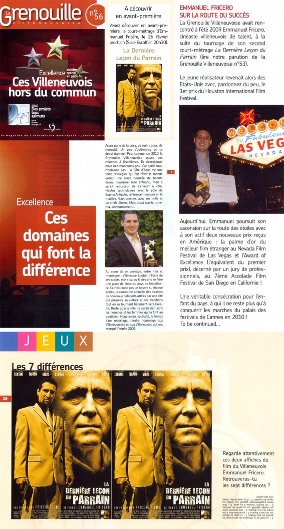 En savoir + ›La Grenouille Villeneuvoise – Emmanuel Fricero sur la route du succès. Article de presse paru en janvier 2010 dans la Grenouille Villeneuvoise n°56, accompagné du jeu des 7 différences sur l’affiche de « La Dernière Leçon du Parrain ». Article en Pdf : https://fricerofilms.com/wp-content/uploads/2015/01/LaGrenouilleJanv10.pdf