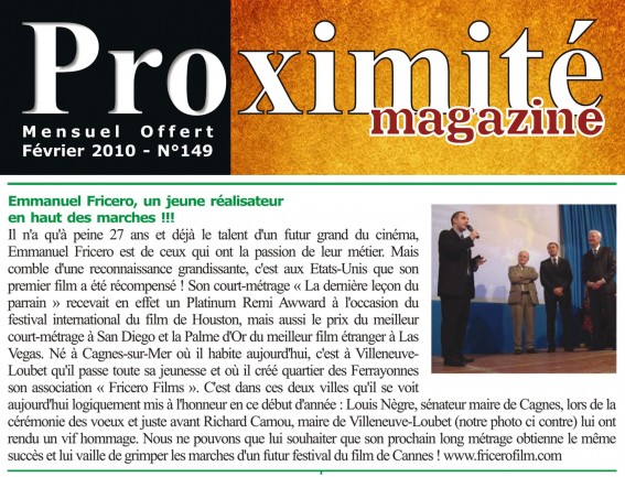 En savoir + ›Emmanuel Fricero, un jeune réalisateur en haut des marches !!! Article de presse paru en Février 2010 dans le Proximité Magazine n°149.