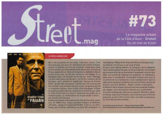 En savoir + ›Street Mag – Le Rêve Américain Article de presse paru pendant le 62e Festival de Cannes (20 Mai 2009) dans la rubrique cinéma du Street Mag n°73.