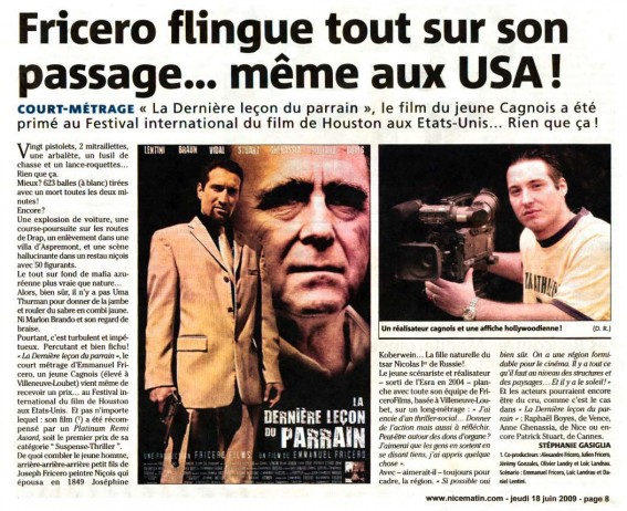 En savoir + ›Emmanuel Fricero fait un carton au festival international du film de Houston. Article de presse paru dans le Nice Matin du jeudi 18 juin 2009.
