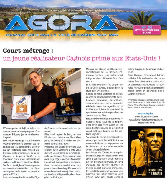 En savoir + ›Court-métrage: Un jeune réalisateur Cagnois primé aux Etats-Unis ! Article de presse paru dans l’AGORA (n°51, 3e trimestre 2009), journal édité par la ville de Cagnes-sur-mer.