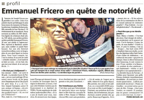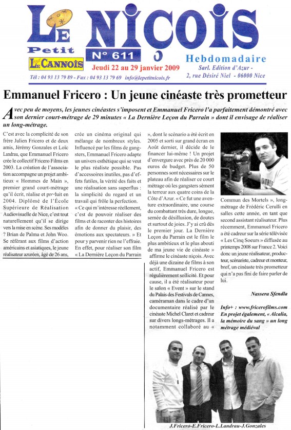 Emmanuel Fricero: Un jeune cinéaste très prometteur Article de presse paru dans l’hebdomadaire Le Petit Niçois n°611 de janvier 2009.