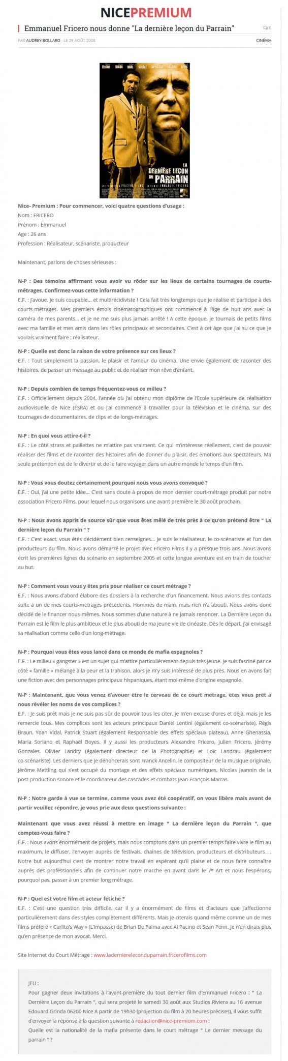 En savoir + ›Octobre 2008 par Nice Télévision Emmanuel Fricero, réalisateur et producteur du court « La dernière leçon du parrain » et Daniel Lentini, comédien principal et co-scénariste ont été invités sur le plateau de Nice Télévision dans l’émission d’Allessandra Pope: Cultures Nice.