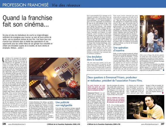 En savoir + ›Quand la franchise fait son cinéma… Deux questions à Emmanuel Fricero, producteur et réalisateur. Article paru dans le magazine mensuel L’Officiel de la Franchise en septembre 2008.