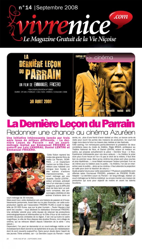 En savoir + ›La Dernière Leçon du Parrain. Redonner une chance au cinéma Azuréen Article de presse paru dans le magazine Vivre Nice de septembre 2008.